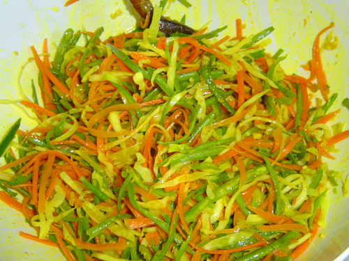 Σοτάρουμε τα λαχανικά και τα κρατάμε στην άκρη. Στη συνέχεια τηγανίζουμε σε καυτό λάδι το σκόρδο, το gingembre (τζιντζερ) και προσθέτουμε τα λαχανικά και το κουρκουμά. Προσθέτουμε το ξύδι και αν χρειάζεται αλάτι. Είναι έτοιμο.